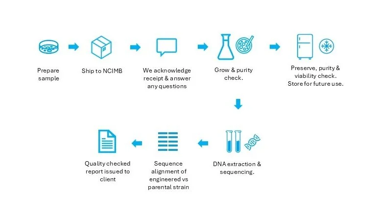 NCIMB provides an integrated, frictionless service to support companies working in microbial DBTL. The client simply sends the strain, and NCIMB manages everything from there on: this includes whole-genome sequencing, sequence alignment, preservation and storage, with chain-of-custody documentation.